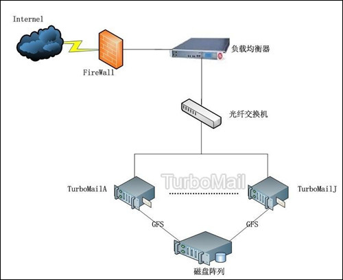 一臺存儲整列可掛載多臺服務器,每臺服務器部署完整的TurboMail郵件服務器,為了保證用戶有順暢的使用。
