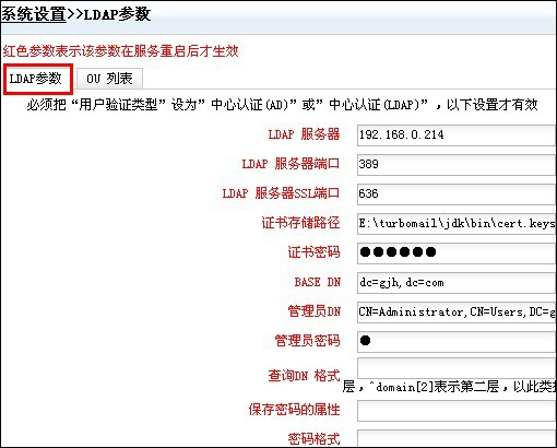 進(jìn)入郵件系統(tǒng)管理界面,系統(tǒng)設(shè)置?D?D》LDAP參數(shù),如圖: