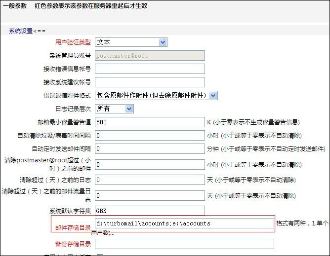 3. 登錄郵件系統(tǒng)管理員=>>系統(tǒng)設(shè)置=>>一般參數(shù)=>>郵件存儲目錄設(shè)置成d:\turbomail\accounts;e:\accounts保存 。