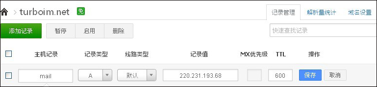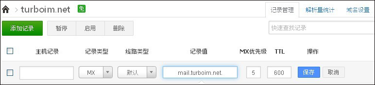 主機記錄為空,記錄類型為MX,記錄值為剛才添加的A記錄“mail.turboim.net.”,保存。