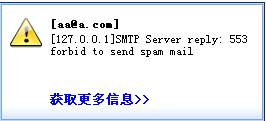 一旦用戶郵件賬戶被鎖定,該用戶將不能在郵件客戶端如outlook、foxmail等使用該郵件賬戶發(fā)送郵件。此時郵件客戶端會提示: