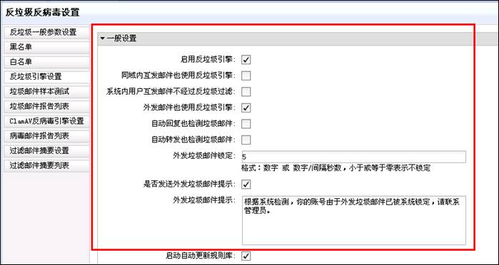 系統(tǒng)管理員可根據(jù)實際情況,設(shè)置“外發(fā)垃圾郵件鎖定數(shù)”,以及外發(fā)垃圾郵件提醒郵件的內(nèi)容。用戶被鎖定后,需要向管理員申請解鎖并修改郵箱密碼。