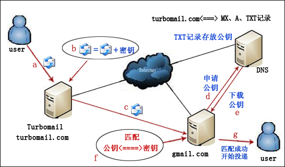 TurboMail郵件系統(tǒng)支持DKIM功能,客戶配置使用該功能后,發(fā)送郵件時在每封電子郵件上增加加密的數(shù)字標(biāo)志,以支持接收方與合法的互聯(lián)網(wǎng)地址數(shù)據(jù)庫中的記錄進(jìn)行比較。由于GMAIL、YAHOO、SINA、QQ等大型郵箱系統(tǒng)會對收件進(jìn)行DKIM驗證,因此配置此功能后,能大大提高客戶們發(fā)郵件至這些大型郵箱系統(tǒng)的成功率。