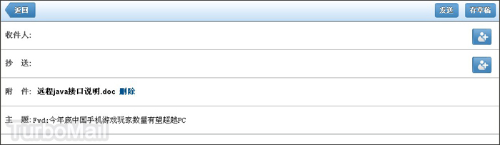 TurboMail郵件系統(tǒng)為了迎合廣大郵箱用戶的需求,開(kāi)發(fā)網(wǎng)頁(yè)郵箱iPad專屬界面,使用全新的UI和適用于iPad的交互方式,收發(fā)郵件有更佳的操作體驗(yàn),并提供圖片和附件的在線預(yù)覽功能,除了Office文檔,還支持Zip和Rar。除此之外郵箱界面采用Dojo編程開(kāi)發(fā),讓人賞心悅目,所有操作在觸摸中都能完美實(shí)現(xiàn)。