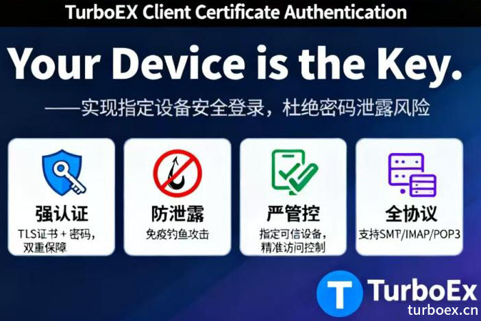 TurboEx郵件系統(tǒng)新增關鍵的安全增強功能——客戶端證書認證。本功能通過支持各類郵件客戶端使用TLS證書認證訪客身份、限定可安裝證書的指定認證設備雙重功能,徹底杜絕了黑客最常用的從Outlook這類郵件客戶端作為攻擊入口的安全隱患。