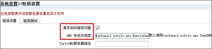 SMS 發(fā)送實(shí)現(xiàn)類填寫:turbomail.mobile.sms.RemoteSendSMS