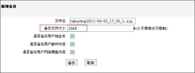 解決方法:通過修改TurboMail程序,將備份改成可以設(shè)定備份的文件大小,比如設(shè)置單個(gè)備份文件2GB,當(dāng)備份超過2GB,自動(dòng)生成下一個(gè)備份文件,直到執(zhí)行備份為止。如截圖所示: