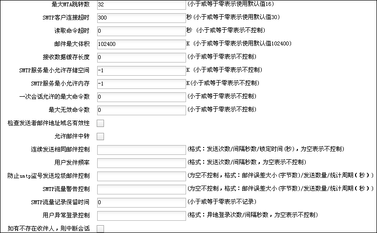 能夠?qū)κ招湃藗(gè)數(shù)、最大發(fā)送郵件容量、每次連接可以發(fā)送的郵件數(shù)量、同一個(gè)發(fā)信人每15分鐘可以發(fā)送的郵件數(shù)量、同一個(gè)發(fā)信人每天可以發(fā)送的郵件數(shù)量、同一個(gè)IP的同時(shí)連接數(shù)等參數(shù)進(jìn)行限制,保證系統(tǒng)安全。