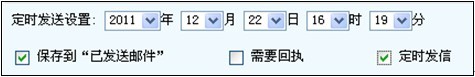 ★“定時發(fā)信”:點擊后顯示“定時發(fā)送設(shè)置”欄,預(yù)設(shè)郵件發(fā)送時間,郵件將準時在預(yù)設(shè)時間發(fā)出。