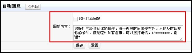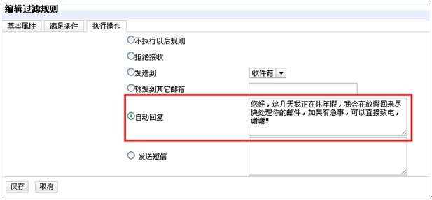 2)通過個人過濾器,系統(tǒng)對符合條件的郵件執(zhí)行自動回復(fù)。