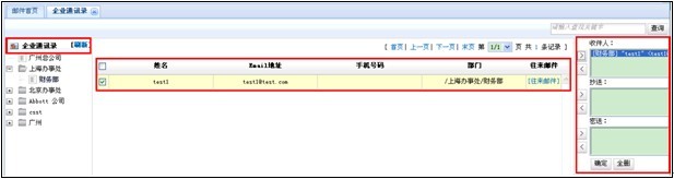 此外,用戶在寫信時,可以直接選中某個部門或者某個組織,則用戶發(fā)信到這個部門或者組織,該部門或該組織下的用戶都能收到這封郵件。
