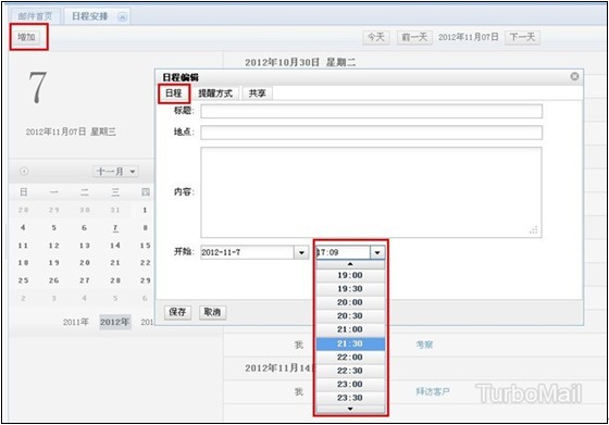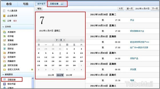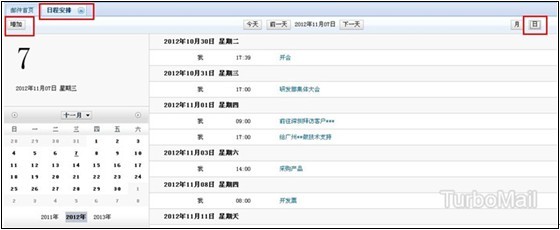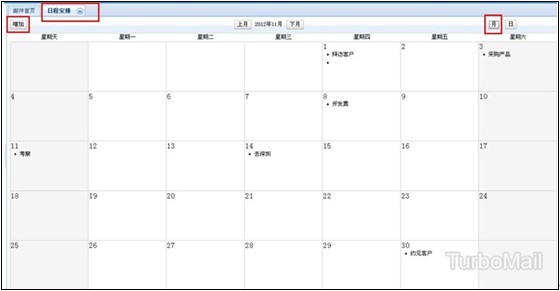 日程安排是TurboMail系統(tǒng)提供的網(wǎng)絡(luò)日歷,用戶通過(guò)日程安排,記錄和安排自己的日常工作。整個(gè)日程安排界面簡(jiǎn)潔美觀,可根據(jù)天、周、月安排工作,并可實(shí)現(xiàn)共享、提醒功能。