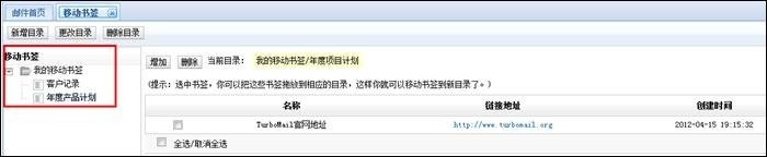 移動(dòng)書(shū)簽,是TurboMail郵件系統(tǒng)提供給用戶的書(shū)簽收藏夾,用戶在瀏覽網(wǎng)站時(shí),可以把一些重要的網(wǎng)站收藏在郵箱移動(dòng)書(shū)簽中,日后需要使用時(shí),可以隨時(shí)登陸郵箱查找需要的書(shū)簽。